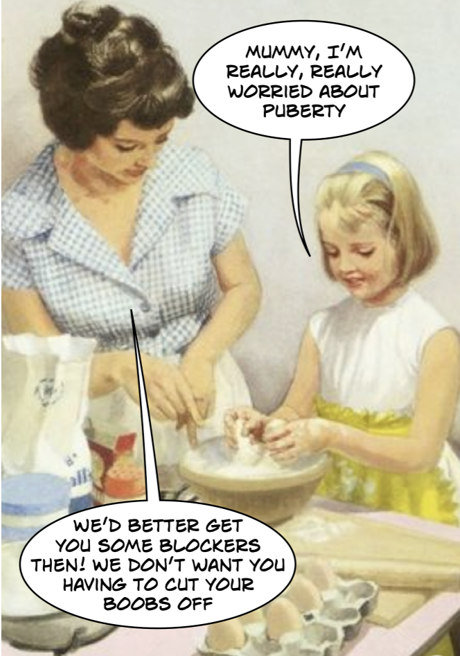 Remember, children put on blockers, often kids who are same-sex attracted, or autistic, or who have co-exisitng mental health issues, do not decide to stop taking them. And a child who has their puberty blocked and then goes on to take cross-sex hormones will be sterile. So now we are sterilising gay kids.
