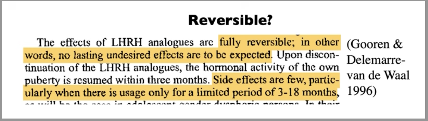In 1996 Gooren made the claim that GnRHa ‘blockers’ were ‘fully reversible, in other words no lasting undesired effects are to be expected…. side effects are few particularly when there is usage for a limited period of 3-18 months’.