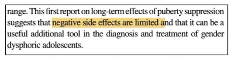 Yet at the same time she advocated for giving hormones to younger patients because “there is no reasonable expectation that their cross-sex identity will change”. So concerns were raised and circumnavigated even back then.