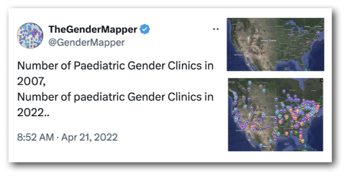 The first gender clinic for children opened in Boston in 2007. Gender Mapper follows and charts the growth of these clinics and released the maps below. That is in America, of course, and obviously it could never happen here.
