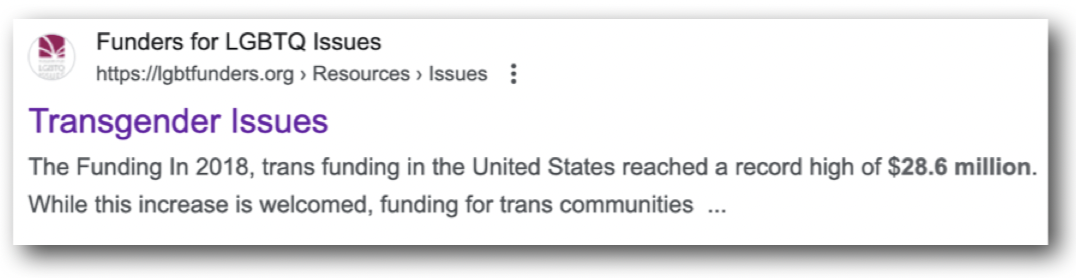 Between 2003 and 2013, she reports, funding for transgender issues in the USA increased more than eightfold reaching a record high of $8.3 million. The same source that gave Bilek her figures tells us that in the following five years it more than tripled, reaching a high of $28.6 million in 2018. The 2024 figure? You tell me.