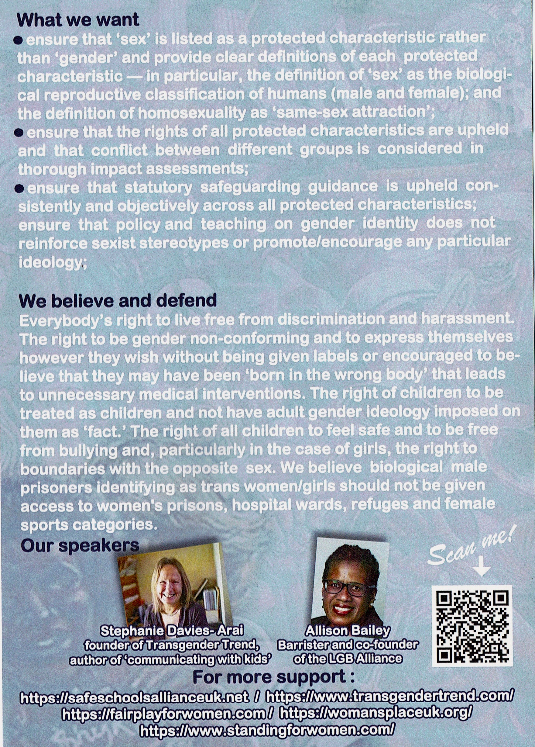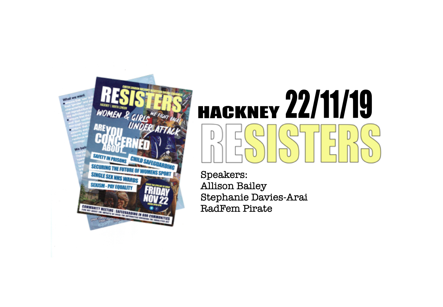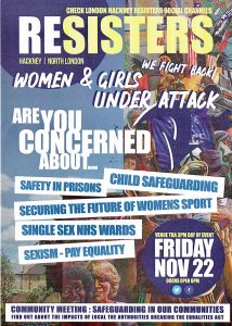 The leaflet laid out the aims of the Resisters and named the night’s speakers: Allison Bailey, barrister and co-founder of the LGB Alliance, and Stephanie Davies-Arai, founder of Transgender Trend and author of ‘Communicating with Kids‘.