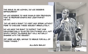 A woman with a legal background asked what steps could be overcome concerning mixed sex toilets in private institutions such as the workplace and Bailey responded that ‘we need to keep going to law’ and challenging policies, suggesting that one ‘well crafted letter’ can often cause an HR department to back down.