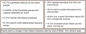 Davies-Arai referred us to Lisa Littman’s study on parental reports of adolescent children coming out with ROGD and the startling statistics surrounding them. 82.8% children were female, with a mean age of 16.4 years. A huge 41% had expressed a non-heterosexual orientation before identifying as transgender and 62.5% were diagnosed with at least one mental health disorder or neurodevelopmental disability before experiencing ROGD.