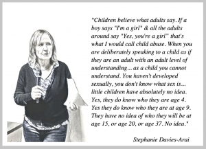 Replacing ‘sex’ with ‘gender identity’ in school policies “results in confidentiality/secrecy issues, parental alienation and erosion of sexual boundaries”. The idea that you cannot ‘out’ a trans child means children are being expected to keep that a secret, and “secrets about sex put children at risk”.