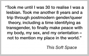 Stephanie referred to the extreme sex stereotypes in childhood marketing, porn culture, homophobia and misogyny and suggested that these things may make some lesbians feel it is safer to be read as men. Social media plays its part, and allows contagion to spread so much faster than it could historically.