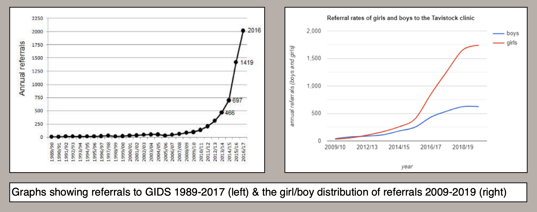 Traditionally childhood onset gender dysphoria is a very rare condition that only affects boys. Around 2009 the figure began to rise and a few years later girls overtook boys. This is not the pattern of gender dysphoria we know because it is starting in early adolescence.