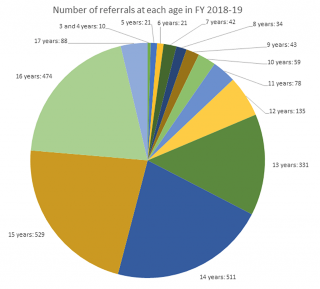 Looking at this pie chart we can see that children aged 13-16 comprise the biggest increase, and the thin, pale blue slice that is 17 year olds is so small because most 17 year olds are being seen by adult services.
