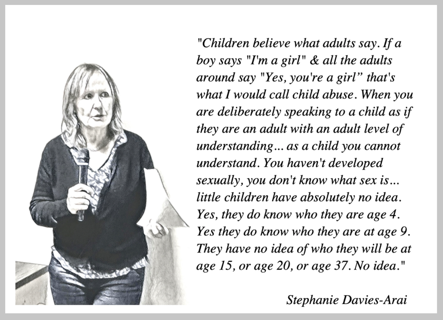 “There has been a real targeting of children’s education… of children in schools, but also targeting of gender identity services… who have pressure put on them by groups like Mermaids and GIRES and Gendered Intelligence, for affirmation and for earlier and earlier medical transition. In adult society we are saying ‘yes you can identify as a woman, yes you’ve got a penis’, you don’t have to change your clothes even… yet the same activists are campaigning for earlier and earlier medicalisation of children. That’s a real anomaly to me.”