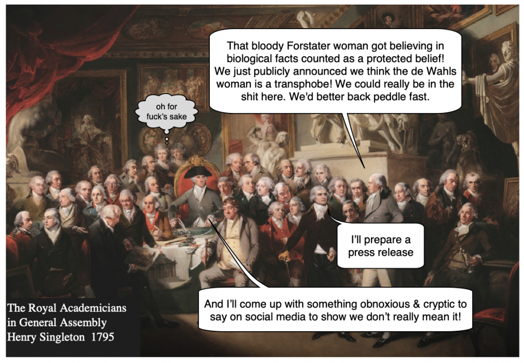 It is interesting to note that the RA’s policy on Equality and Diversity has added ‘gender, gender identity or expression’ to the Equality Act’s list of protected characteristics. It has not removed sex, although its willingness to view de Wahls’ view that a woman is an adult human female as ‘transphobic’ suggests that this is not much more than lip service.