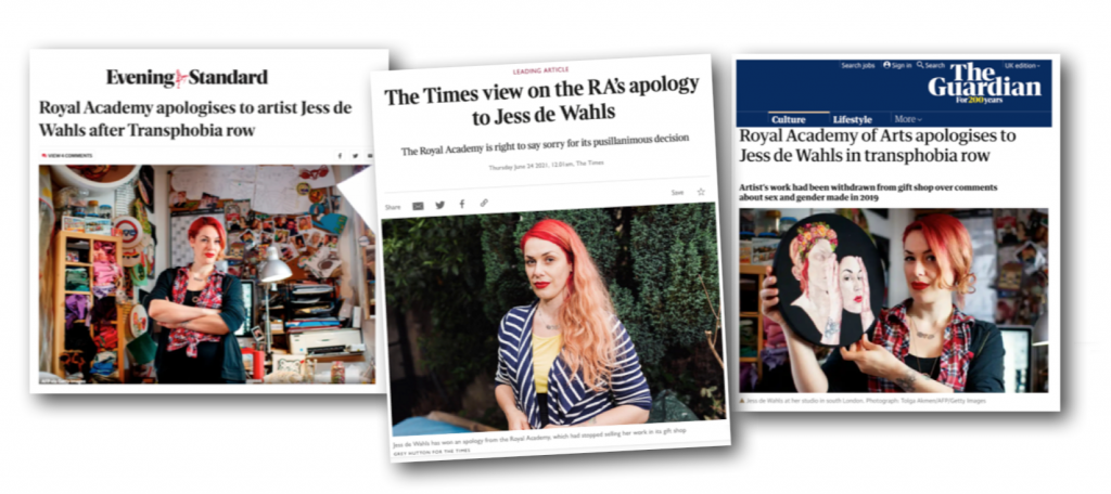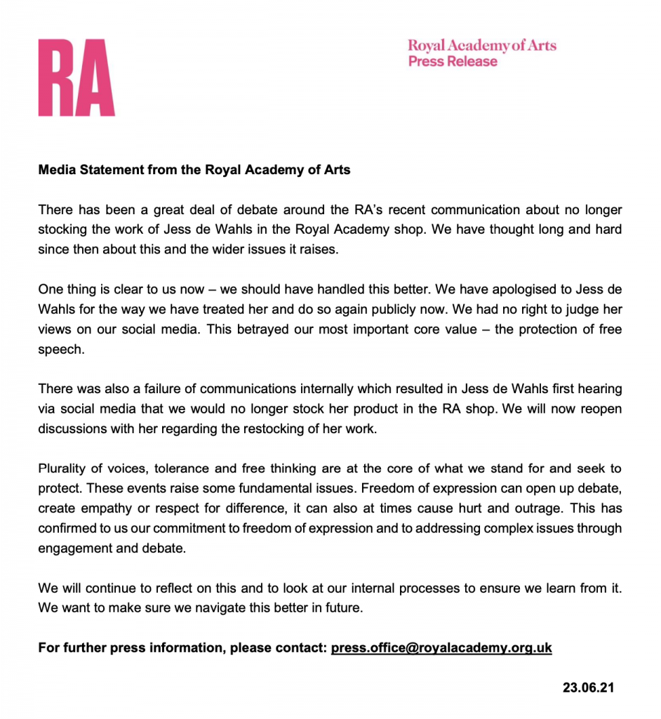 “There has been a great deal of debate around the RA’s recent communication about no longer stocking the work of Jess de Wahls in the Royal Academy shop. We have thought long and hard since then about this and the wider issues it raises.