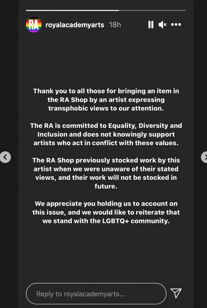“Thank you to all those for bringing an item in the RA shop by an artist expressing transphobic views to our attention. The RA is committed to Equality, Diversity and Inclusion and does not knowingly support artists who act in conflict with these values. The RA shop previously stocked work by this artist when we were unaware of their stated views, and their work will not be stocked in future. We appreciate you holding us to account on this issue and we would like to reiterate that we stand with the LGBTQ+ community.”