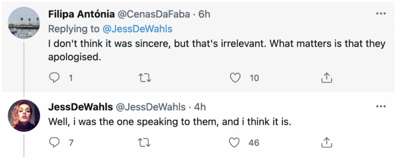 One thing is clear to us now –we should have handled this better. We have apologised to Jess de Wahls for the way we have treated her and do so again publicly now. We had no right to judge her views on our social media. This betrayed our most important core value –the protection of free speech.