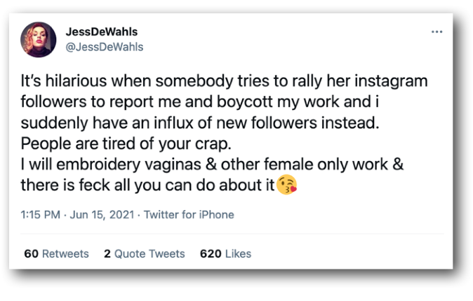 “I will embroidery vaginas & other female only work & there is feck all you can do about it,“ she wrote on Twitter on June 15th.