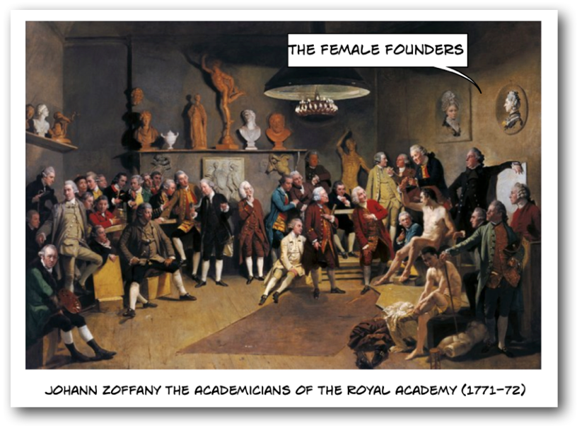 Johann Zoffany’s 1771/2 painting, The Academicians of the Royal Academy, shows the blokes getting ready for a life drawing class- the female founders are just pretty pictures on the wall. It wasn’t until 1967 that the then-four female Academicians were invited to dine with the lads. But of course, there’s nothing surprising about such sexism.