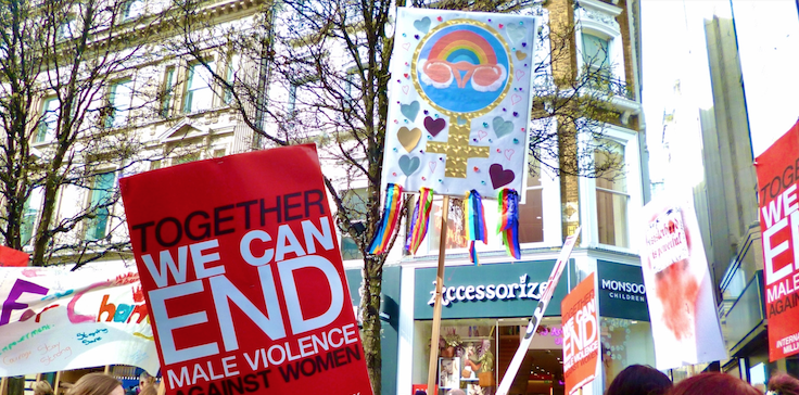 Later, a friend and I blew up part of that photo and stuck it on a banner adorned with ribbons which we held proudly aloft on the 2017 Women’s March in London.