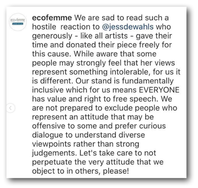 One thing is clear to us now –we should have handled this better. We have apologised to Jess de Wahls for the way we have treated her and do so again publicly now. We had no right to judge her views on our social media. This betrayed our most important core value –the protection of free speech.