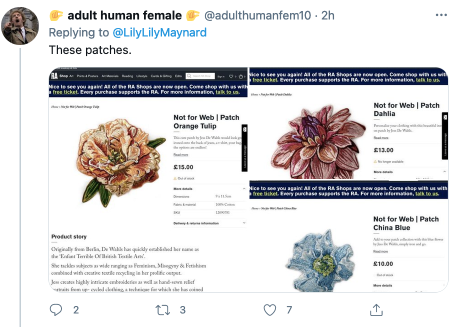 Nothing less than a blue embroidered flower. Avert your eyes lest ye should receive the full force of its transphobic hatred. Those trying to find it via the RA website are now are met with this notification:
