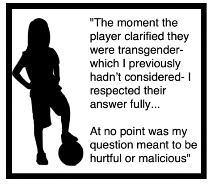 Kick It Out, armed with complaints from the man in question and his coach (who should hang his head in shame) accusing the girl of ‘persistent transphobia’, trotted off to report her to the Football Association.