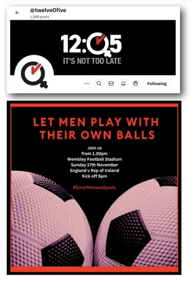 You can search tweets about the protest with the hashtags #AreYouAMan, #HesAMan #SeeYouSunday and #SaveWomensSports. The Twelve0Five Twitter account is here and the Twelve0Five website here.