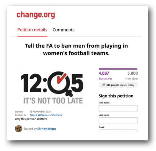 It starts: “The Football Association must implement the right it has in the Equality Act 2010 to bar men from playing in women’s football teams. It is ignoring the conclusion of the 2021 Sports Councils’ Equality Group report that ‘it is not possible to maintain fairness and safety in sport for females if trans-identifying males are also allowed into female categories.’