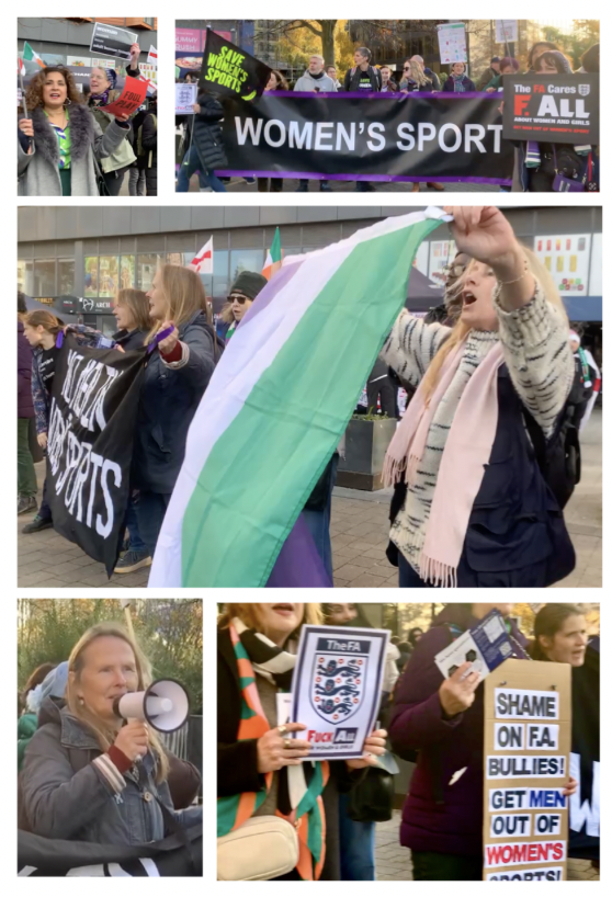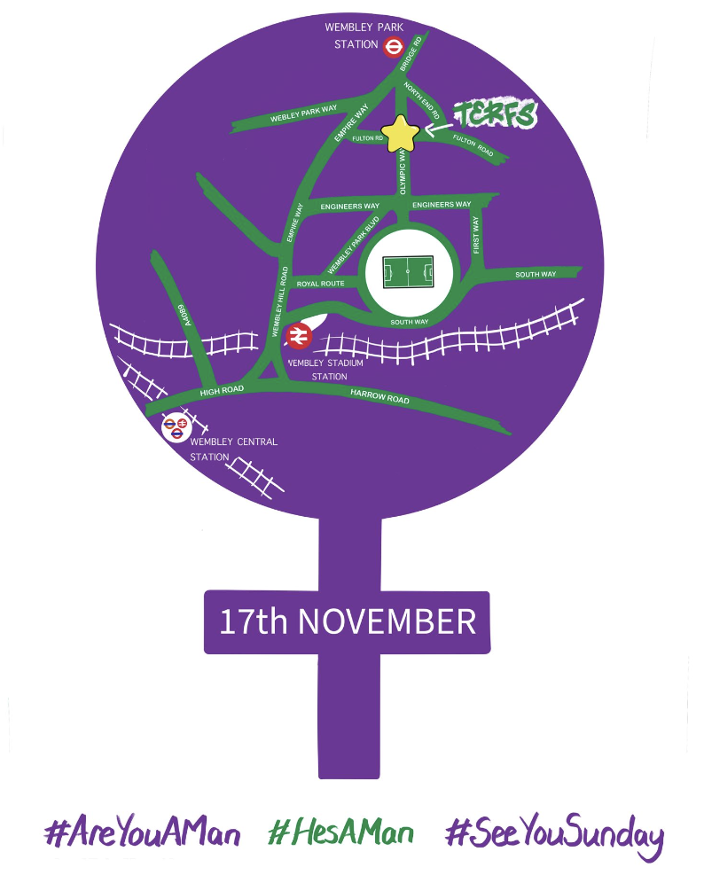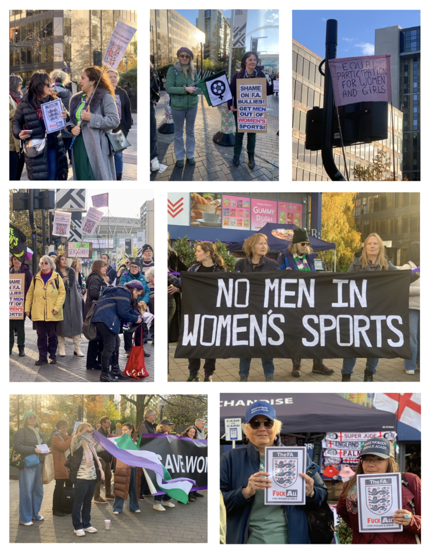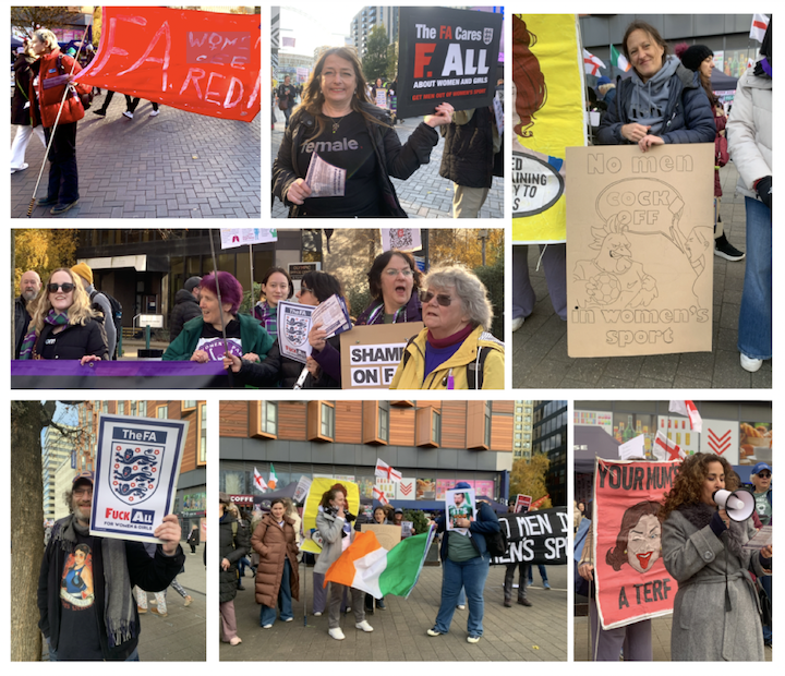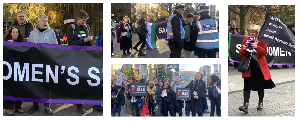 Twelve0Five, the group of women responsible for the #SelfIDHarms protest outside the German Embassy in London earlier this month were organising again. Faced with both the FA’s decision to ban a girl from playing football because she dared to ask a man if he was a man, and its continued inclusion of men on women’s teams, the group arranged a protest for the big men’s England v Ireland match at Wembley Stadium on Sunday 17th November. And what a protest it was!