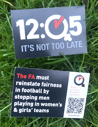 The cards were business-card-sized and called on the FA to ‘reinstate fairness in football by stopping men playing in women’s and girls’ teams’.