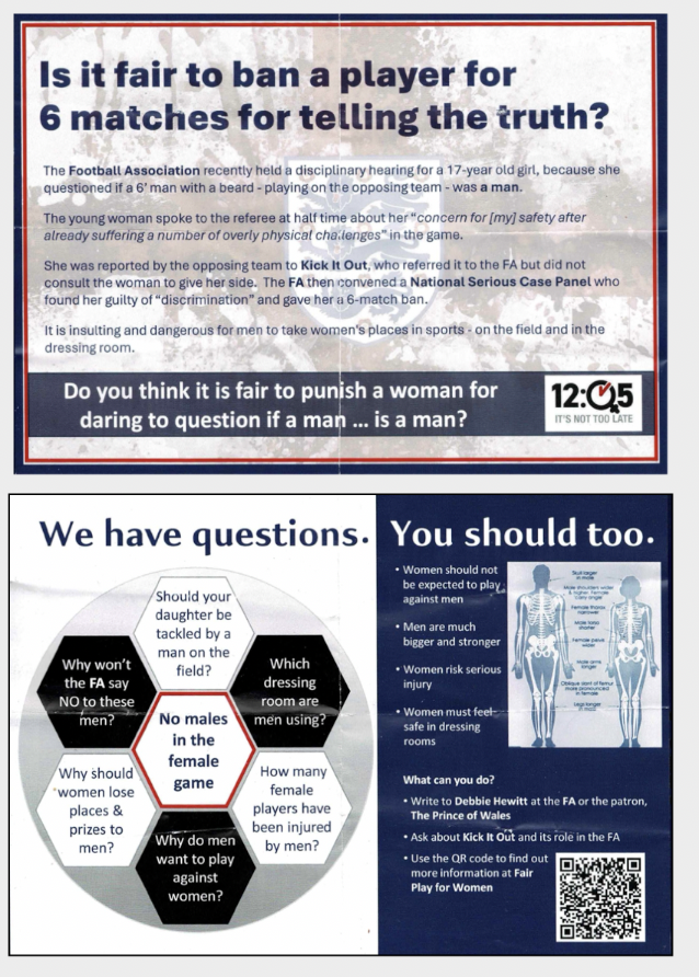 The leaflet asked some thought-provoking questions and suggested that concerned members of the public could write to Debbie Hewitt at the FA, or the FA patron, the Prince of Wales. It featured a QR code, linking to the Fair Play for Women website.