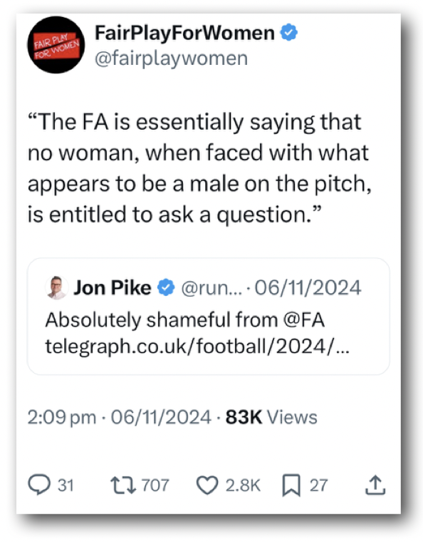 “I am deeply concerned that the FA is not providing all women and girls with fair, safe football because of its policy allowing male players – those with XY chromosomes, but a transgender identity – to play in the women’s game…”