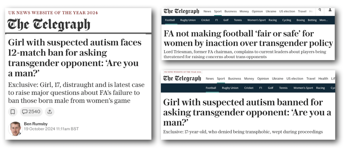 Telegraph Sport, on October 19th reported that the girl said she had “become ‘confused” about the participation of the trans player during the match in question, due to the latter “wearing jewellery and sunglasses” and not being in opposition kit.”