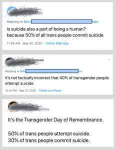 It amazes and frightens me the way these lies become “truth” even when the actual truth is out there. “Trans kids kill themselves if they can’t transition.” “Transwomen are murdered at much higher rates than women.” “Unarmed black men are murdered by white policemen every minute of every day.” (I know it’s a different subject, but it’s just as much a provable lie as the trans kids stuff.)