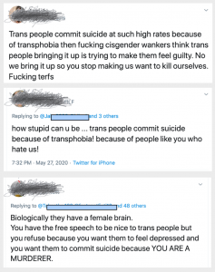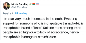 To precis, this way of thinking believes that tweeting support for a woman who says it’s not possible to change sex means that you are directly responsible for the suicides of trans-identified children.
