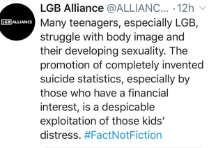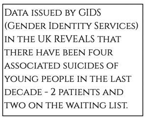 “Any risk of suicide is terrifying for parents,” observes Transgender Trend. “Every suicide is an awful tragedy and for this reason we feel that exaggerating the risk and constantly using the threat of suicide is extremely unhelpful and irresponsible.”