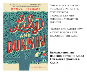 ‘Representing the Rainbow in Young Adult Literature’ (Jenkins & Cart) reviews the young adult fiction book ‘Lily and Dunkin’, an Amazon best book of 2016, and Southern Book Award Winner 2017. The book is aimed at 5-7th graders (that’s kids aged 10-12 to us Brits) and tells the story of Tim, who ‘knows’ that he is really a girl called Lily. The review tells us: