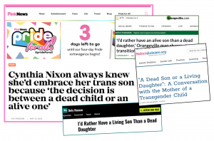 Yet media outlets jump on the idea of trans suicide in a way that they do not do with any other demographic, reporting over and again random statistics on suicide among trans kids, repeatedly quoting the mantra “I’d rather have a live son than a dead daughter,” making wild and unsubstantiated claims about suicide risks and insisting that anyone who questions the claims ‘literally’ wants trans-identified people to die.