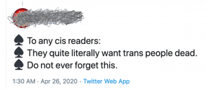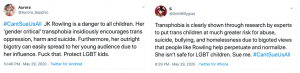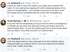Yesterday (29/5/20) Canadian transactivist Nicole Spurling tweeted: “Definitely something to keep a close eye on. In recent years, Rowling has made it clear that she can no longer be trusted around children.”