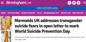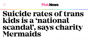 Mermaids’ open letter on National Suicide Prevention Day 2019 begins by reminding the reader that “research from the charity Stonewall shows that nearly half of young trans people have attempted suicide.”