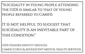 “Suicidality in young people attending the GIDS is similar to that of young people referred to child and adolescent mental health services. It is not helpful to suggest that suicidality is an inevitable part of this condition.”