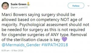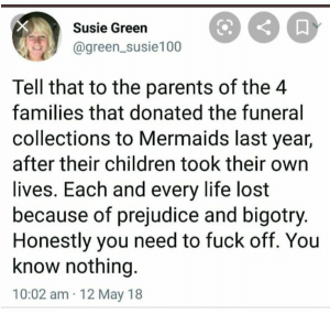 In 2018 Green posted on Twitter that in the previous year four families had donated the funeral collections to Mermaids after their children took their own lives, suggesting that Mermaids had been involved with at least four trans-identifed children who had died by suicide.