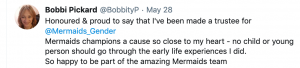 Just a few days ago, Mermaids appointed a new trustee, Bobbi Pickard, who started transitioning just three years ago at the age of 47, and has fathered two children. Perhaps someone who started transitioning so late in life will bring a fresh perspective to things? Well… er… no.