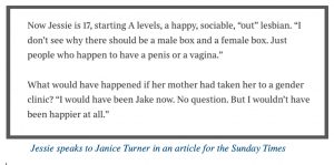 … except I’m not. I’m the mum of a teenage girl who identified as a boy for nearly a year – insistently and persistently- the mum of a girl who is now a happy lesbian. I did not support my daughter Jessie’s transition and, as she told Janice Turner in a recent interview for the Times, Jessie believes she would probably have been on testosterone by now if I had done so. A friend of Jessie’s, Hazel, identified as a boy for over a year. Hazel is now a glamorous young woman who dresses in conventionally female clothing and dates boys. So I know, first hand, that children DO desist, baby-butches and glamourpusses alike. This is not rare.