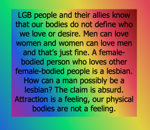 LGB people and their allies know that our bodies do not define who we love or desire. Men can love women and women can love men and that’s just fine. A female-bodied person who loves other female-bodied people is a lesbian. How can a man possibly be a lesbian? The claim is absurd. Attraction is a feeling, our physical bodies are not a feeling. LGB does not advocate that bodies should be modified to fit stereotypes. LGB doesn’t care what we wear or what hobbies we have. LGB wants to get rid of those stereotypes! LGB people do not demand that the rest of society complies with a delusion. LGB rights ask that we are all accepted just as we are, whatever body we are born in. The LGB fight for equal rights is not dependent on the erasure of the rights of another marginalised group and LGB people do not go into schools asking little kids if they might be gay.