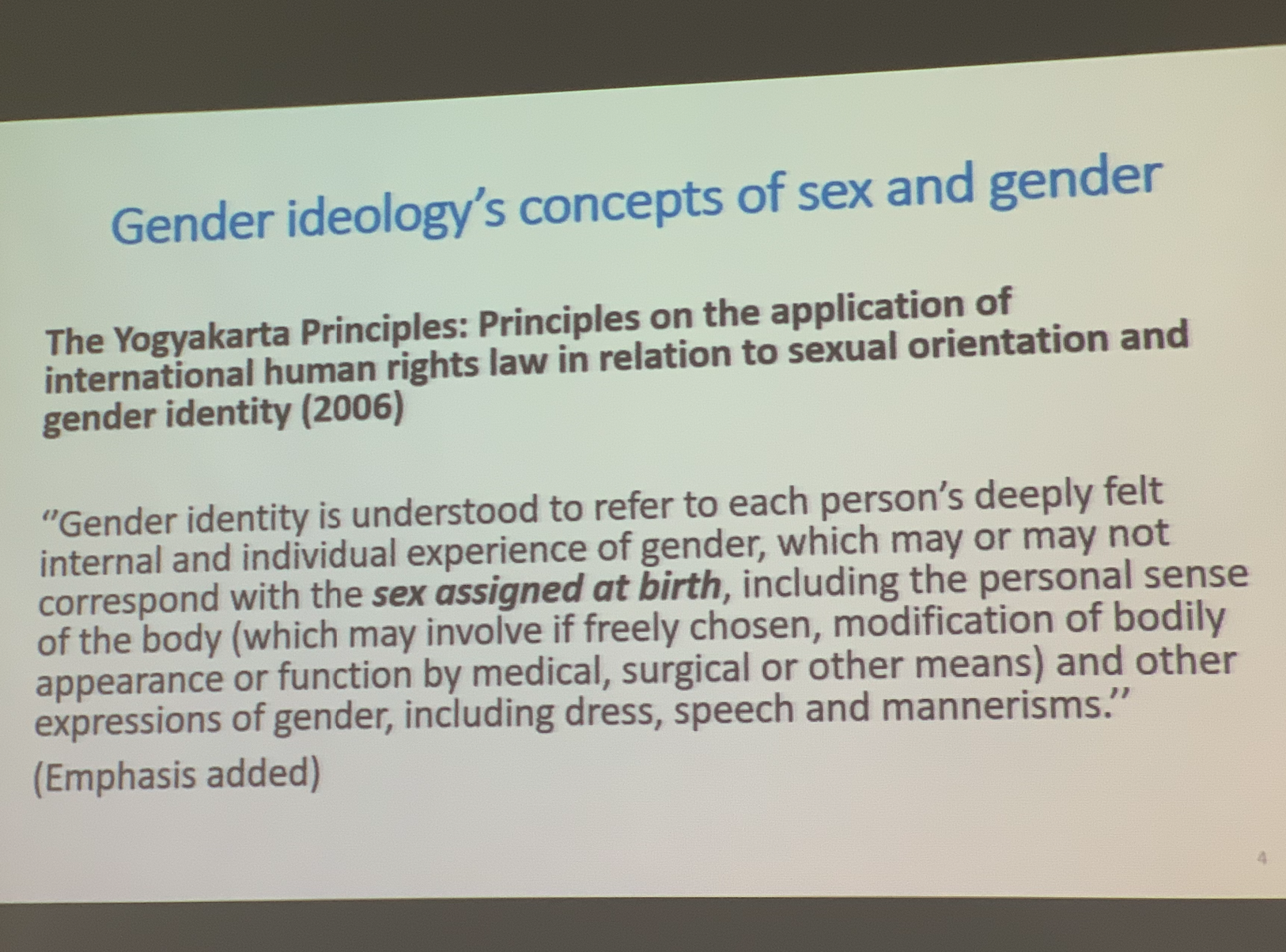 “Gender ideology,” said O’Hara, showing us slides based on the ideas of the Yogyakarta Principles,“turns that on its head”.