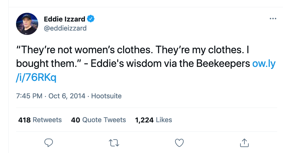Back in 2014, a few months before Phillips began reading out her list, Izzard came out with his now famous quote, ““They’re not women’s clothes. They’re my clothes. I bought them.”