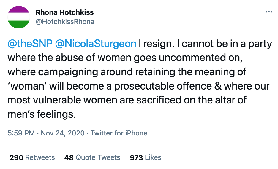 In November 2020 Rhonda Hotchkiss left the SNP writing, ‘I resign. I cannot be in a party where the abuse of women goes uncommented on, where campaigning around retaining the meaning of ‘woman’ will become a prosecutable offence & where our most vulnerable women are sacrificed on the altar of men’s feelings.”