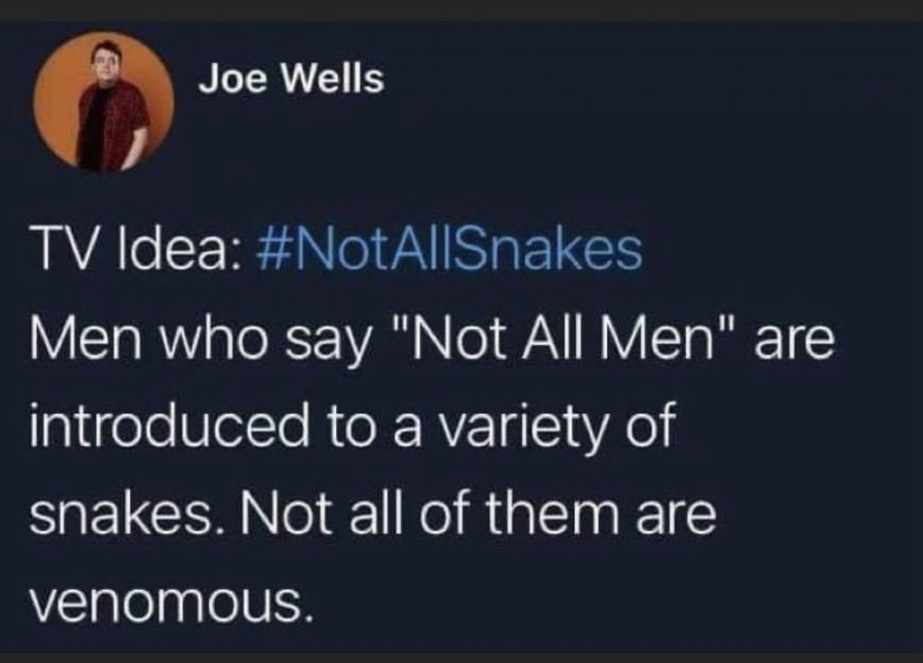 As Joe Wells, whoever he may be, observes: “TV idea: #notallsnakes. Men who say ‘not all men’ are introduced to a variety of snakes. Not all of them are venomous.”