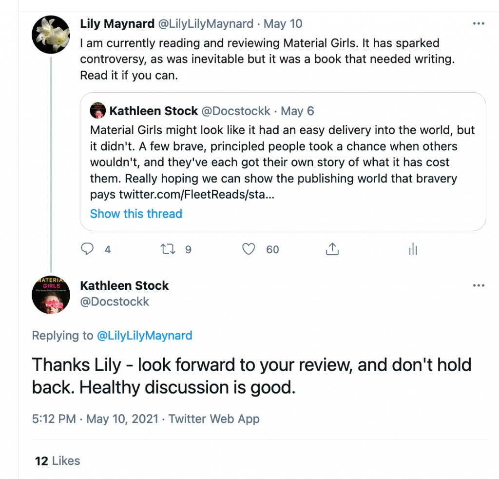 “Material Girls is out today,” wrote Stock on Twitter, on the morning of 6th May. “I wrote it because collectively, our institutions, educators, and political leaders are under a spell; and because there’s been a concerted movement to shut down discussion of that fact, and what it means. Here’s to a conversation #YesItsADebate”