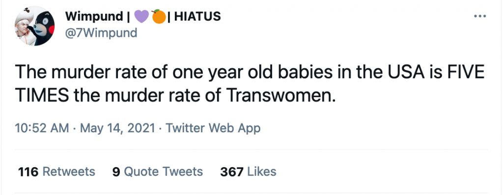 Roughly one trans-identified person per year is murdered in the UK – suggesting that trans-identified people are actually slightly safer than the rest of the population. Suicide statistics are also shamelessly misrepresented and exploited by organisations like Mermaids, and reports of hate crime can include simple acts of ‘misgendering’.