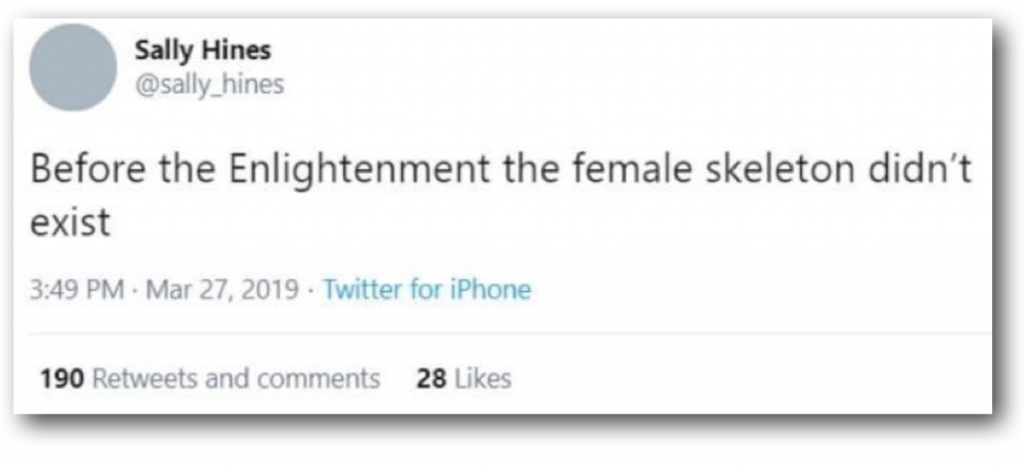 Other conclusions drawn from this way of thinking are Sally Hines observation, inspired by the ruminations of Thomas Laqueur, that ‘before the enlightenment the female skeleton didn’t exist’. (To be fair, Laqueur also says he has ‘no interest in denying the reality of sex’.)