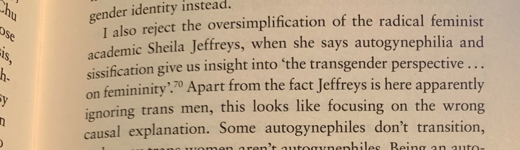 Whilst Stock discusses the thoughts of Serano, Long Chu “Andrea Long Chu writes in her book…” and Moser, no space is given to the pivotal work of Janice Raymond or Sheila Jeffreys. Stock is, in fact, dismissive of what she calls Jeffreys ‘oversimplification’ of autogynephilia.